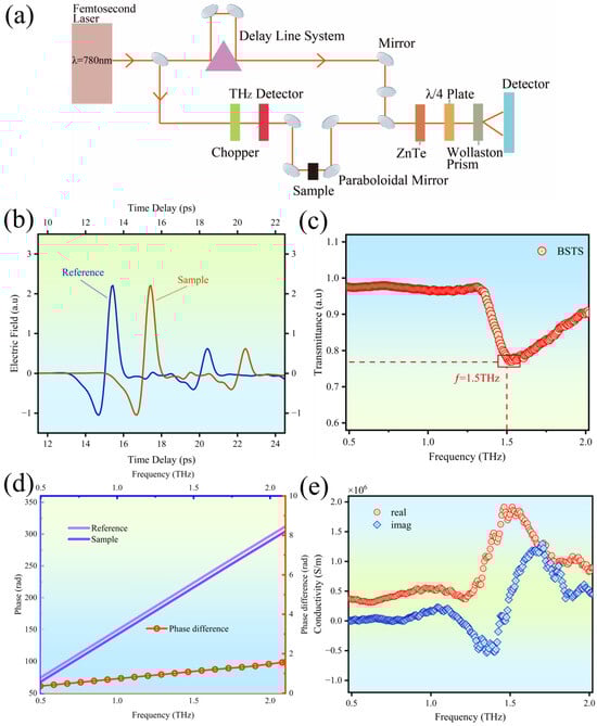 (a) Fundamental working principle of Terahertz Time-Domain Spectroscopy (THz-TDS). (b) Time-domain distribution of the Terahertz pulses for the BSTS sample and reference sample. (c) Terahertz transmission spectrum of the BSTS sample. (d) Phase variation of the BSTS sample in the frequency domain. (e) Real and imaginary parts of surface conductivity of the BSTS sample.