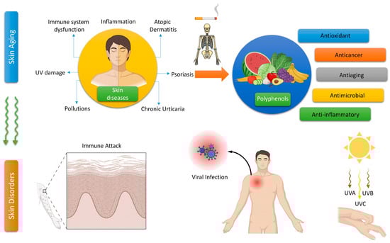 The potential role of polyphenols in the treatment of significant skin disorders. The potential of polyphenols as an additional therapeutic, along with their ability to mitigate deleterious effects, could also improve the negative consequences caused by sunshine exposure.