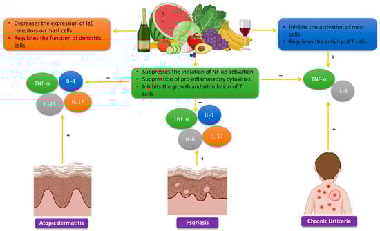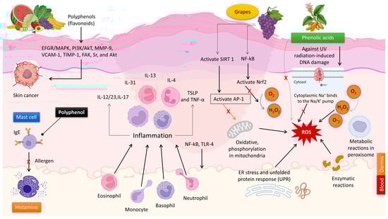 Polyphenols demonstrate anti-inflammatory effects by inhibiting the production of pro-inflammatory cytokines, such as IL-4, IL-5, and IL-13. Furthermore, research has shown that polyphenols have the ability to reduce the synthesis of IgE receptors in mast cells. Consequently, this results in a decline in the attachment of IgE antibodies, leading to a subsequent reduction in the release of histamine and other substances that cause inflammation. Polyphenols, such as quercetin and EGCG, have shown the capacity to control the functioning of dendritic cells. These cells play a vital role in initiating the Th2 immune response [165,166]. Atopic dermatitis generally ameliorates throughout the summer, and patients can improve the healing of sun-induced skin lesions by utilizing topical therapies that are abundant in polyphenols or by taking nutraceuticals that are based on polyphenols (Figure 4).
