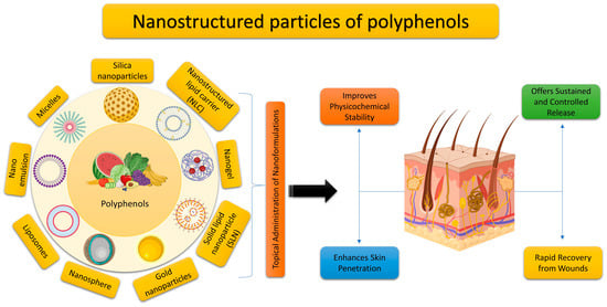 Diverse nanostructured molecules are employed in the creation of nanoformulations for the delivery of polyphenols in skin treatment.