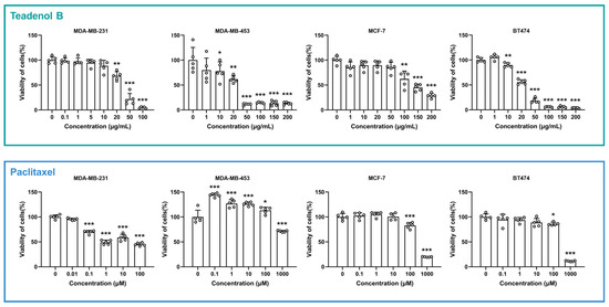Survival rate of four types of breast cancer cells varied with teadenol B or paclitaxel concentration. The white circles represent the scatter data points for each group. The data are presented as mean ± SD (* p < 0.05, ** p < 0.01, *** p < 0.001, n = 5).