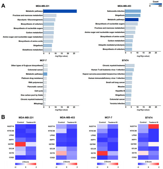 The Kyoto Encyclopedia of Gene and Genome (KEGG) access database (www.kegg.jp/kegg/pathway.html, accessed on 17 January 2024) stores the function of gene and genome information, along with visual representations of various cellular biochemical processes. Analyzing the metabolic pathways enriched with differentially expressed proteins allows for an understanding of which pathways experience notable systemic changes under differing experimental conditions. In this study, KEGG pathway analysis was performed on proteins with significant expression differences compared with the control group to discover the biological pathways by which teadenol B interferes with four types of breast cancer cells. Figure 3A lists the enrichment analysis results of the KEGG pathway with the top 10 protein expression differences according to Fisher’s precise test.