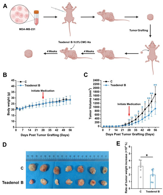 Inhibitory effect of teadenol B on the transplanted tumor in nude mice. (A) Flowchart of tumor transplantation and drug treatment in nude mice; (B) changes in body weight of nude mice over time. The data are presented as mean ± SD (p > 0.05, n = 7); (C) the changes in breast tumor volume with time in nude mice were statistically significant from 2 to 4 weeks after administration. The data are presented as mean ± SD (ns, p > 0.05; * p < 0.05, ** p < 0.01, n = 7); (D) at week 8, mice were sacrificed for extract untreated and teadenol B-treated tumor tissues; (E) the effect of administration of teadenol B on the rate of breast tumor weight increase was statistically significant after four weeks of administration. The data are presented as mean ± SD (* p < 0.05, n = 7).