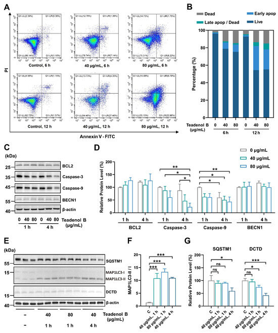 According to the proteomic results (Figure 3B), the DCTD protein may be the key protein involved in the inhibition of teadenol B on cancer cell growth. Considering the close relationship between DCTD and apoptosis, we conducted further experiments and found that after treatment with teadenol B, both early and late apoptosis of MDA-MB-231 cells increased, with a more significant increase in early apoptosis. This indicates that teadenol B primarily inhibits cancer cell growth by inducing programmed cell death in MDA-MB-231 cells while maintaining the integrity of the cell membrane (Figure 5A,B). One hour after treatment with teadenol B, there was a slight increase in the expression level of BCL2, but with no statistical difference (p > 0.05). We also examined the levels of the uncut forms of caspase-9 and caspase-3 (Figure 5C,D). Compared to the control group treated for 1 h, the expression levels of the uncut form of caspase-9 decreased significantly after 4 h of treatment with teadenol B (40 µg/mL, p < 0.05; 80 µg/mL, p < 0.01). Compared to the control group treated for the same duration, 80 µg/mL of teadenol B significantly reduced the protein level of the uncut form of caspase-3 (p < 0.05). This further demonstrates that teadenol B can induce apoptosis in cells.