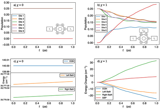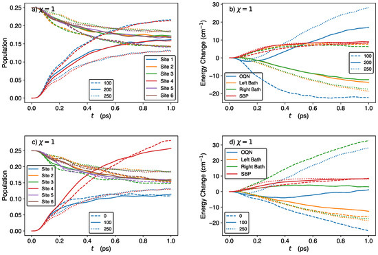 In Figure 5c,d, we plot the results for cm−1 and different values of . As can be seen, increasing the energy of site 4 from 0 to 100 cm−1 does not cause a significant change in the site 4 population; however, increasing the energy of site 4 from 100 to 250 cm−1 causes a ≈50% drop in the site 4 population after 1 ps. Moreover, when the energy of site 4 is smaller than those of the remaining sites, site 4 becomes the most populated site after 1 ps. The populations of the remaining sites do not change significantly after going from to 100 cm−1, but they each increase by several percent after 1 ps after going from to 250 cm−1. As for the energy changes, increasing the energy of site 4 leads to more energy transfer from the right bath to the system, which in turn causes the OQN energy to change from decreasing to increasing. When both and are greater than and the SS become populated, also becomes positive. Thus, when is also positive, the OQN will gain energy from the baths.