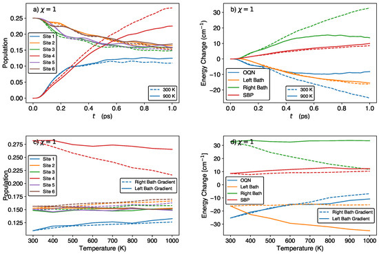 In Figure 2a,c, we see that increasing the right bath temperature leads to a decrease in the population of site 4 and relatively small increases in the populations of the remaining sites. As for the energy changes (see Figure 2b,d), the OQN and left bath lose energy, but the energy loss becomes smaller and remains relatively constant, respectively, with increasing right bath temperature. On the other hand, the SBP and right bath gain energy, but the energy gain remains relatively constant and becomes smaller, respectively, with increasing right-bath temperature. When we fix the temperature of the right bath at 300 K and increase the temperature of the left bath, the behaviours of the site populations are similar to those observed in the case when the temperature of the right bath is increased, except for that of site 4 which now exhibits a substantially smaller decrease (see Figure 2c). As for the energy changes (see Figure 2d), the behaviours of the SBP and OQN energies are similar to those observed in the case when the temperature of the right bath is varied. However, the bath energies are significantly different, with the energy changes in the left and right baths becoming more negative and remaining relatively constant, respectively, with increasing left-bath temperature.