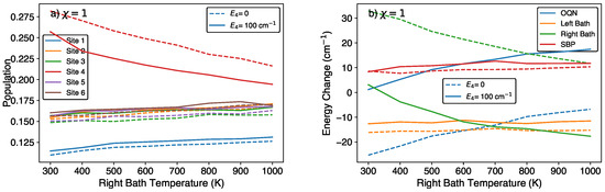 Next, we vary the bath reorganization energy . From Figure 4, we see that increasing the right-bath reorganization energy causes the site 1/4 population to decrease/increase, the right-bath energy to increase, and the system to lose more energy; the populations of the remaining sites, left-bath energy, and SBP energy remain relatively constant. On the other hand, we see that increasing the left-bath reorganization energy does not have a significant impact on the site population and energy changes.