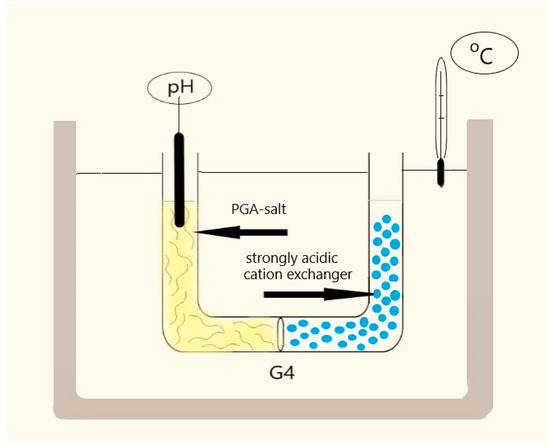 The double-ion-exchange experiments were performed in a U-shaped tube consisting of a porous G4 glass diaphragm in the bottom part (Figure 1). The left branch of the tube was supplied with a pH meter and the volume of the alkali polygalacturonate solution was 50 mL. The right branch of the U-shaped tube was filled with water and an acidic form of a water-swelled solid Varion KSM (sulfonated, macroreticular) ion-exchange resin, Nitrokemia Co., Balatonfuzfo, Hungary. The amount of ion-exchanger material (100 g) was enough to ensure excess acid capacity relating to the amount of alkali ion content of the PGA salt. The double-ion-exchange processes were conducted until the pH stopped changing on the left side of the tube. The final pH values of the reaction mixtures are given in Table S1.