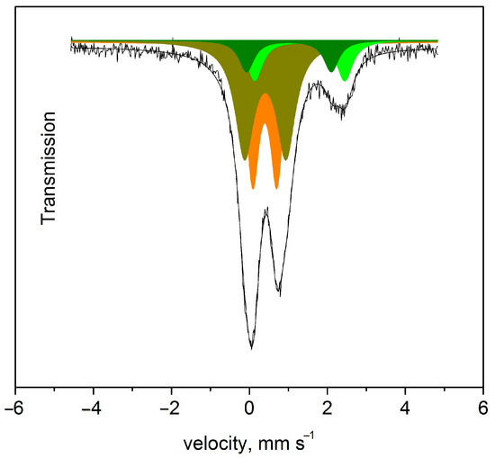 Mössbauer spectra of compound 2 at 300 K (red and brown areas show two different FeIII, whereas the light and dark green areas show two different FeII contributions).