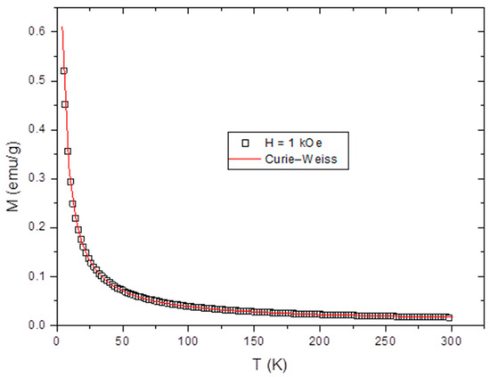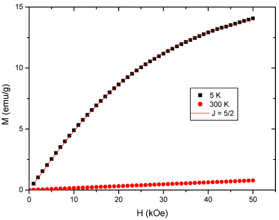 The magnetic measurements were performed with the help of a Quantum Design (Taipei City, Taiwan) MPMS-5S SQUID magnetometer at a temperature and field range of 5 to 300 K and 0 to 50 kOe using a gelatin capsule as a sample holder for the powder samples with a mass of 50 to 100 mg. During the measurements, the samples were surrounded by He as an exchange gas of several-millibar pressure.