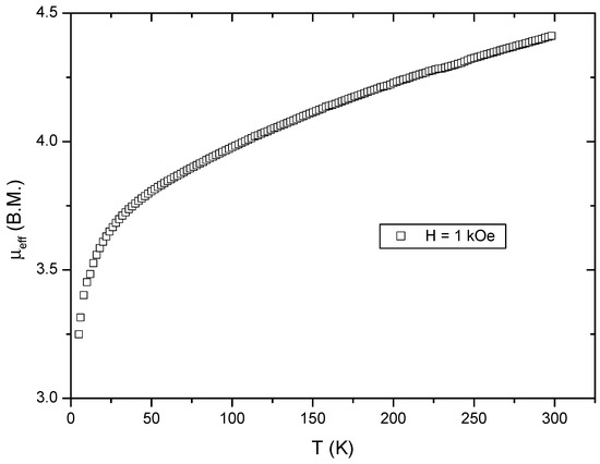Effective magnetic moment as a function of temperature for compound 2 calculated from the temperature dependence of χMT (where χM is the molar susceptibility measured in a magnetic of H = 1 kOe).