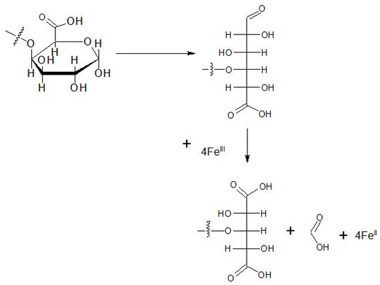 Previous studies on iron(III)–polygalacturonate complexes showed that the iron(III)–polygalacturonate reaction products always contaminated a small amount of iron(II), indicating the existence of some redox interaction between the poly(galacturonic acid) and iron(III) ions as well [17,25]. The redox chemistry of monomer galacturonic acid is well established [26,27,28,29,30]; one D-galacturonic acid unit consumes four equivalents of FeIII in an acidic pH environment with the formation of four equivalents of FeII and one equivalent of formic acid.