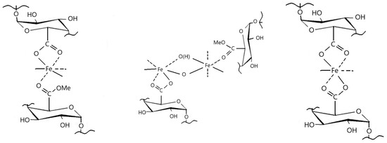 Poly(galacturonic acids) and their various iron salts have great importance as anti-anemic agents added to various pharmaceutical compositions [1,2,3,4,5,6,7]. Their zinc, magnesium, and iron salts are also widely used in commercial products as food supplements (FerrocompTM, MulticompTM, In Vitro Ltd., Dunakeszi, Hungary). The properties of these metal polygalacturonates depend on the method of preparation of poly(galacturonic acid) from pectin by alkaline, acidic, or enzymatic hydrolysis. Accordingly, the demethylation degree and polymer chain length (the average molecular weight and the distribution of the chain lengths) of polygalacturonic acids vary in a wide range, and are generally shorter than the chain lengths of the precursor pectin [8,9,10,11,12,13,14]. The biochemical properties of iron-complexed polygalacturonic acid derivatives—including the release and bioavailability of iron by the organs—strongly depend on the valence of iron, the strength and environment of the coordination around iron ions, and the solubility or reactivity of these polygalacturonate polymers. The main factors of solubility for these complexes, however, are the average molecular weight and polarity of the complexes. Since the composition, structure, and coordination characteristics of iron–polygalacturonate complexes have important roles in their stability, biological properties, solubility, and bioavailability, these basic chemical parameters should be known for the recently prepared new iron–polygalacturonate complexes as well.