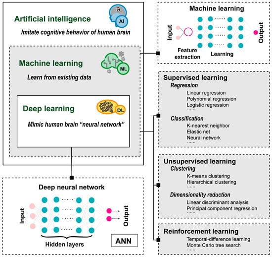 Introduction diagram of artificial intelligence and its subfields: machine learning and deep learning.