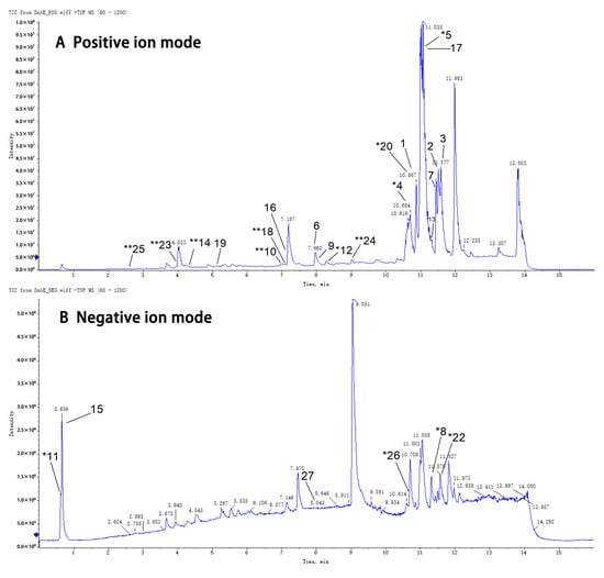 Total ion chromatograms of DnAE in positive ion mode (A) and negative ion mode (B). * Confirmed with standards. ** Tentatively identified based on library and/or literature data. The bold numbers: indicate the corresponding numbers in Table 1.