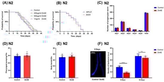 Effect of DnAE on the lifespan and healthspan of wild-type C. elegans (N2). (A) Survival of N2 worms treated with or without different concentrations of DnAE. n ≥ 60. (B) Survival of N2 worms treated with EtOH (214 µmol/mL, consistent with the concentration of alcohol contained in 1 mg/mL DnAE) or ddH2O. n ≥ 60. (C) Average and total number of eggs produced per hermaphroditic worm. n ≥ 20. (D) Number of pharyngeal pumping events by worms. (E) Number of bending events in worms after 20 s. n ≥ 20. (F) Representative fluorescence images show lipofuscin levels in N2 after 5 days. The bar chart indicates the fluorescence intensity of N2 treated with DnAE for 5 and 10 days. (n ≥ 20, *** p < 0.001, ***** p < 0.00001, t test).