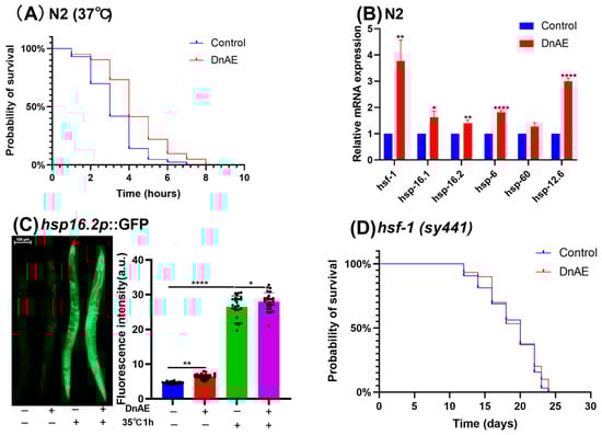 DnAE increased heat stress tolerance by upregulating the expression of hsf-1 and HSPs. (A) Survival curves of N2 cultured at 37 °C; p was calculated using the log-rank test. n ≥ 60. (B) Effects of DnAE on the mRNA expression of hsf-1 and its target genes in N2 treated with 1 mg/mL DnAE for 96 h (n ≥ 1000, * p < 0.05, ** p < 0.01, **** p < 0.0001, multiple t tests). (C) Quantification of hsp-16.2 expression in the hsp-16.2p::GFP mutant strain TJ375 (n ≥ 20, * p < 0.05, ** p < 0.01, **** p < 0.0001, t test). (D) Survival curve of the hsf-1 mutant strain hsf-1(sy441) treated with or without 1 mg/mL DnAE at 20 °C (n ≥ 60, p > 0.05, log-rank test).