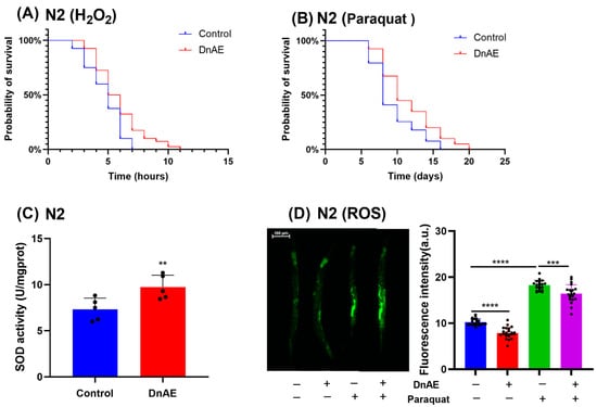 Effect of DnAE on the antioxidant capacity of N2. Survival curve of N2 treated with or without 1 mg/mL DnAE under oxidative stress induced by (A) 10 mM H2O2 and (B) 10 mM paraquat; p was calculated using the log-rank test. n ≥ 60. (C) SOD activity in C. elegans. L4-stage N2 was cultured for 72 h and treated with or without 1 mg/mL DnAE (n ≥ 1000, ** p < 0.01, t test). (D) Representative fluorescence images showing ROS in N2 treated with DnAE and 4 mM paraquat. The bar graph indicates the fluorescence intensity of N2 (n ≥ 20, *** p < 0.001, **** p < 0.0001, t test).
