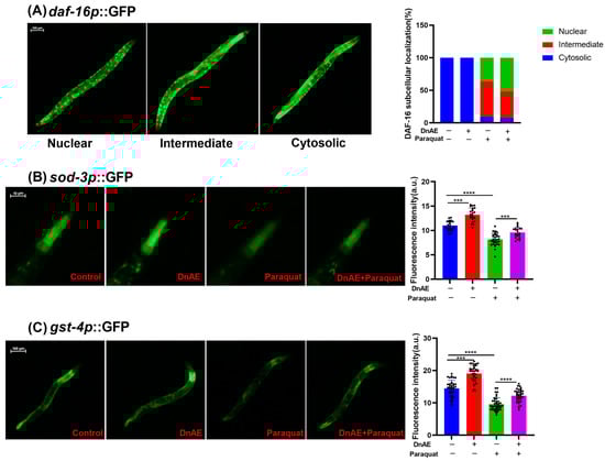 Effects of DnAE on DAF-16 cellular translocation and SOD-3 and GST-4 expression in GFP-tagged N2. (A) Percentage of DAF-16 localization determined by quantitative analysis of the cytosolic, intermediate, and nuclear localization of DAF-16 in daf-16p::daf-16a/b::GFP worms. n ≥ 20. (B) Fluorescence intensity of sod-3p::GFP in CF1553 strain with or without 1 mg/mL DnAE (n ≥ 20, *** p < 0.001,**** p < 0.0001, t test). (C) Fluorescence intensity of gst-4p::GFP in CL2166 worms with or without 1 mg/mL DnAE. n ≥ 20.