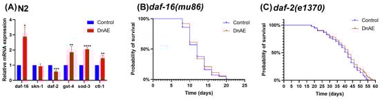 DnAE-mediated extension of the C. elegans lifespan via DAF-16. (A) mRNA expression of skn-1, daf-16, and related target genes in N2 treated with DnAE for 96 h (n ≥ 1000, * p < 0.05, ** p < 0.01, *** p < 0.001, **** p < 0.0001, multiple t tests). (B) Survival curves of DnAE-treated or untreated daf-16(mu86) mutant strain at 20 °C (n ≥ 60, p > 0.05, log-rank test). (C) Survival curves of DnAE-treated or untreated daf-2(e1370) mutant strain at 20 °C (n ≥ 60, p > 0.05, log-rank test).