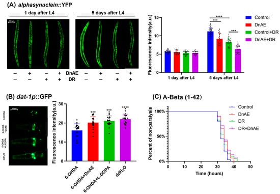 β-Amyloid is the main cause of neuronal degeneration and death around senile plaques in the brains of AD patients. High temperatures can induce its expression in the muscle of the transgenic strain CL4176, resulting in paralysis of the strain [42]. DnAE delayed the paralysis of the CL4176 strain and reduced the toxicity of the β-amyloid protein, In the DR model, CL4176 paralysis was delayed by 7.01%, which increased to 10.01% in the presence of DnAE (Figure 7C and Table S13).