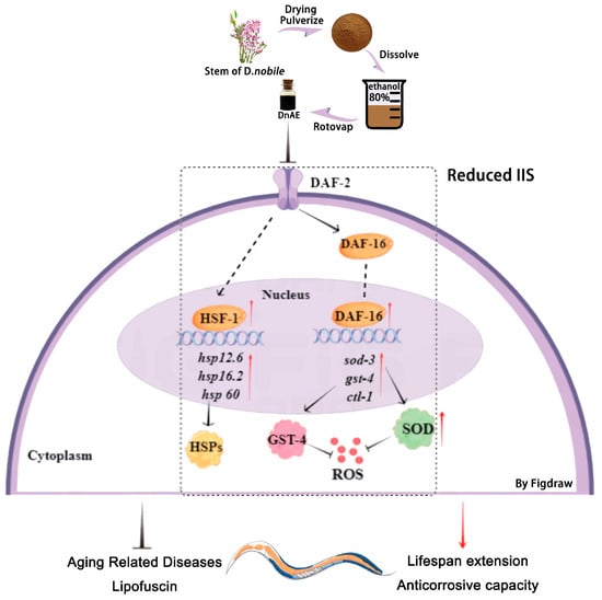 DnAE slowed the accumulation of lipofuscin, reduced the ROS content, and increased the SOD activity of N2. Moreover, it prolonged the lifespan of N2 under oxidative stress and heat stress, which was achieved by upregulating the expression of daf-16 and hsf-1, promoting the nuclear localization of DAF-16, and increasing the expression of sod-3, gst-4, and ctl-1. Additionally, DnAE alleviated 6-OHDA-induced DA-related neuronal degeneration and reduced Aβ-induced toxicity. These results highlight the potential of DnAE for further investigation in extending lifespan and treating age-related diseases (Figure 8).