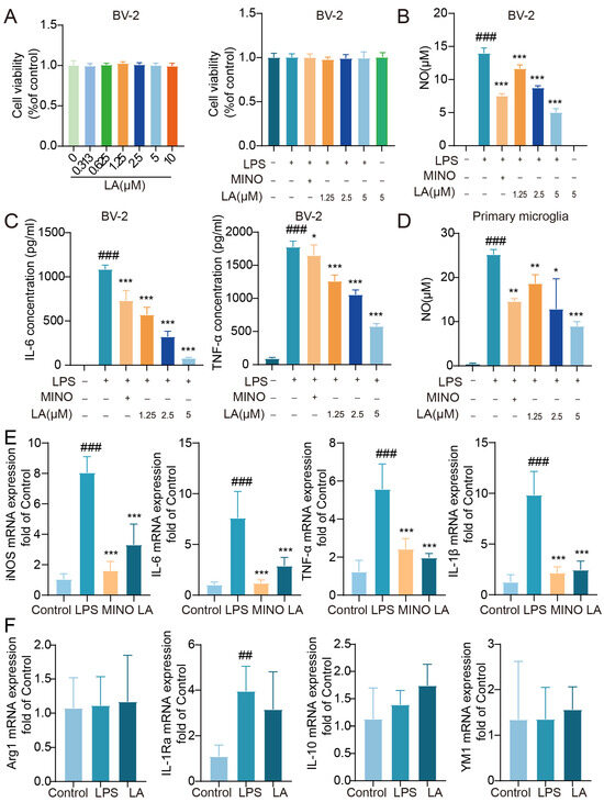 We initially aimed to investigate whether LA has the potential to inhibit the production of inflammatory cytokines in LPS-stimulated BV-2 cells. LA had no significant impact on BV-2 cell viability at concentrations ranging from 0 to 10 μM, whether in the presence or absence of LPS (p > 0.05, Figure 1A). After stimulating BV-2 cells with LPS for 24 h, the levels of pro-inflammatory cytokines, including NO, IL-6, and TNF-α, were significantly higher in the LPS group compared to the Control group (p < 0.001). The positive control drug, minocycline, significantly inhibited the production of these cytokines. LA also inhibited the production of these cytokines in a dose-dependent manner (Figure 1B,C, p < 0.05). Similar results were observed in primary microglial cells (Figure 1D), consistent with those observed in the BV-2 cell line.