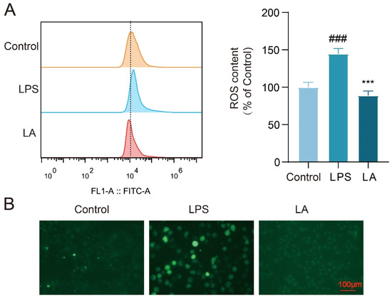 Upon microglia activation, a significant increase in reactive oxygen species (ROS) production occurs within the cells. Elevated levels of ROS have been associated with inflammation and neuronal cell death [17]. To evaluate the intracellular ROS levels, we utilized the fluorescent probe DCFH-DA. Flow cytometry results (Figure 2A) revealed that the intracellular ROS level was significantly higher in LPS-stimulated BV-2 cells after 24 h compared to the Control group (p < 0.001). However, following LA treatment, the ROS level in the LA group was significantly reduced (p < 0.001). Fluorescence microscopy results supported these findings (Figure 2B).