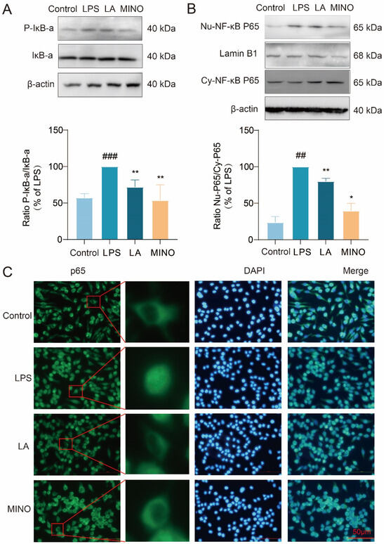 LA inhibits IκB-α phosphorylation and nuclear translocation of NF-κB p65. BV-2 cells were treated with LPS and or LA for 1 h; (A) Western blot results showed that LA was able to inhibit IκB-α phosphorylation; (B,C) The results of Western blot and fluorescence microscopy showed that LA was able to inhibit nuclear translocation of NF-κB p65; vs. Control, ### p < 0.001, ## p < 0.01; vs. LPS, * p < 0.05, ** p < 0.01. Data are presented as the mean ± SD. LA: Levistilide A, LPS: lipopolysaccharide, MINO: minocycline.