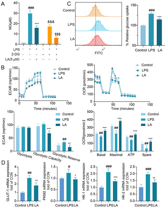 Studies have revealed that as cells’ glycolysis capacity increases, so does their glucose uptake [23]. Flow cytometry results (Figure 4C) indicate that LA treatment effectively inhibited the LPS-induced increase in glucose uptake (p < 0.001).