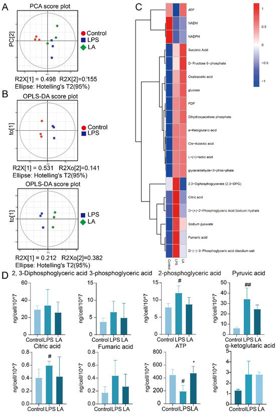 Central carbon target metabolome analysis. (A) PCA scatter plot of total sample of con group, LPS group and LA group; (B) OPLS-DA model scatter plot of CON group vs. LPS group and LPS group vs. LA group; (C) Hierarchical cluster analysis thermodynamic diagram; (D) Histogram of differential metabolites vs. CON, ## p < 0.01, # p < 0.05; vs. LPS, * p < 0.05. Data are presented as the mean ± SD. LA: Levistilide A, LPS: lipopolysaccharide.