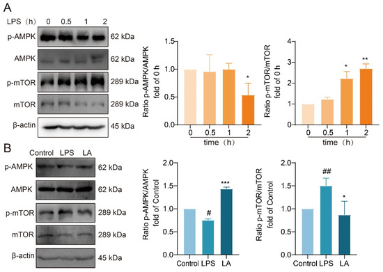 Western blot analysis revealed that following 2 h of LPS stimulation, AMPK phosphorylation was significantly reduced, while mTOR phosphorylation was significantly increased (Figure 6A). However, LA treatment reversed these effects, significantly increasing AMPK phosphorylation (Figure 6B, p < 0.001) and decreasing mTOR phosphorylation (Figure 6B, p < 0.05) compared to the LPS group. These findings suggested that LA has a regulatory effect on the AMPK/mTOR signaling pathway, potentially influencing cellular metabolism and energy balance.