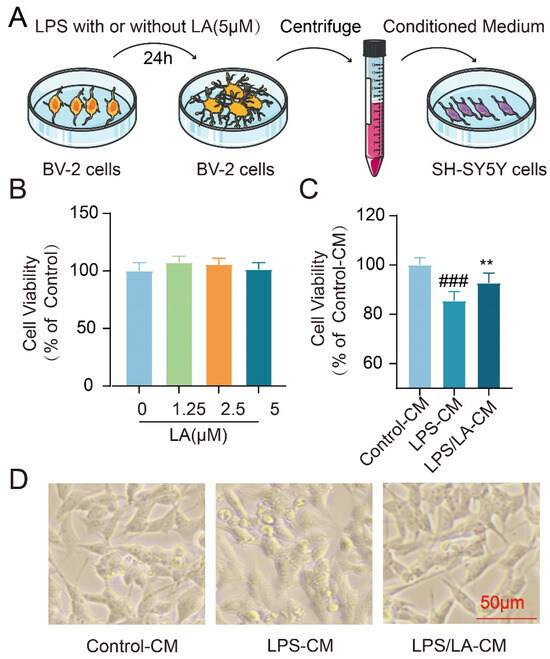 Inflammatory cytokines secreted by activated microglia have the potential to induce neuronal cell death. In our previous study, we observed that LA suppressed the LPS-induced production of these pro-inflammatory factors. This raised the question: Could this inhibitory effect of LA exert neuroprotective benefits? To address this, we examined the impact of the conditioned medium from BV-2 cells on the survival of neuroblastoma SH-SY5Y cells (Figure 7A). Notably, LA alone, at concentrations ranging from 0–5 μM, did not affect the viability of SH-SY5Y cells (Figure 7B). However, when compared to the conditioned medium from the LPS-stimulated group, the medium derived from microglia treated with both LPS and LA demonstrated a remarkable neuroprotective effect on SH-SY5Y cells (p < 0.01, Figure 7C,D). These findings suggest that LA may confer neuroprotection by modulating microglia polarization.