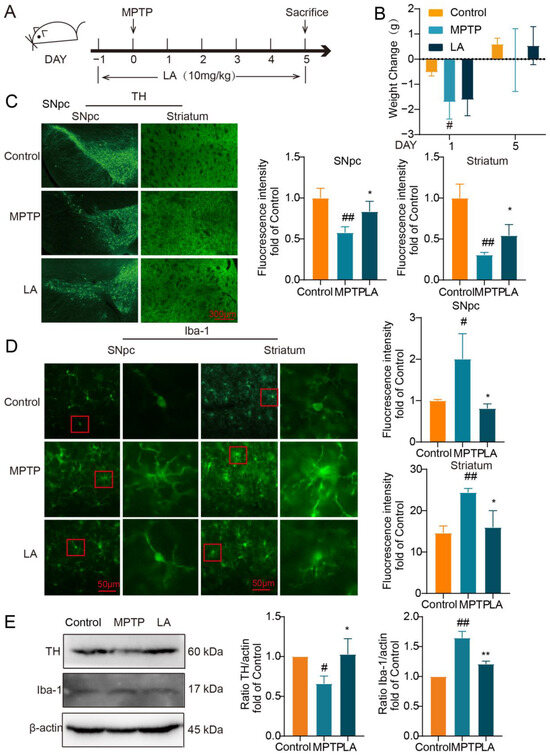 Subsequently, we utilized the MPTP-induced mouse model of Parkinson’s disease to assess the neuroprotective properties of LA in vivo (Figure 8A). As shown in Figure 8B, on the first day following MPTP administration, mice in the MPTP group exhibited a significant reduction in body weight (p < 0.05). After 5 days, the body weight of the MPTP group and LA group had recovered.
