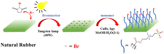 Natural rubber (NR) is an essential material in engineering applications. It is widely used in medical fields due to its high wear and barrier property levels; it is used in supplies such as medical gloves [1,2], condoms [3,4,5], and catheters [6]. The preventative properties of natural rubber latex (NRL) can be applied to manufacture products that isolate pathogens, and NRL is one of the best natural raw materials for biomedical products. However, protein adsorbed on the surface of NR [7] makes it easy for bacteria to contaminate the surface of the material. The adsorption of non-specific proteins, such as via the blockage of the filter membrane during a biological separation procedure or blood clotting in an infusion catheter, can cause potential harm. The initial formation of biological scale and blood clots takes place in the stage of the rapid adsorption of proteins at the molecular level on the surface of an NR material. The development of anti-protein-adsorption NR materials can prevent bacterial adsorption and other biological fouling phenomena in the procedure of the adsorption of biological macromolecules at the solid–liquid interface. Various pathogenic bacteria also harm the health of patients receiving medical treatment. Although the antibacterial properties of natural rubber can be realized through the use of doping and blending certain fillers [8,9,10], an active surface is difficult to maintain in the long term. The modification of antibacterial active molecules on the surface of a substrate can confer long-term antibacterial activity, but there are few studies on the fixation of antibacterial active molecules on the surface of an NR substrate [11]. Grafting antibacterial molecules [12,13] onto the surface of NR directly is a potential way of preparing NRL medical products, but it is difficult to obtain a high-density antibacterial layer on the surface of NR.