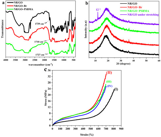 (a) FTIR spectra of NR/GO film, NR/GO-Br film, and NR/GO-PSBMA film. (b) XRD patterns of NR/GO film, NR/GO-Br film, NR/GO-PSBMA film and NR/GO film at stretching. (c) Stress–strain curves of NR-S films (I), NR/GO film (II), NR/GO-Br film (III), and NR/GO-PSBMA film (IV).