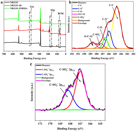 XPS spectra of (a) NR/GO film, NR/GO-Br film, and NR/GO-PSBMA film, (b) C1s and (c) S2p core-level spectra of the NR/GO-PSBMA.