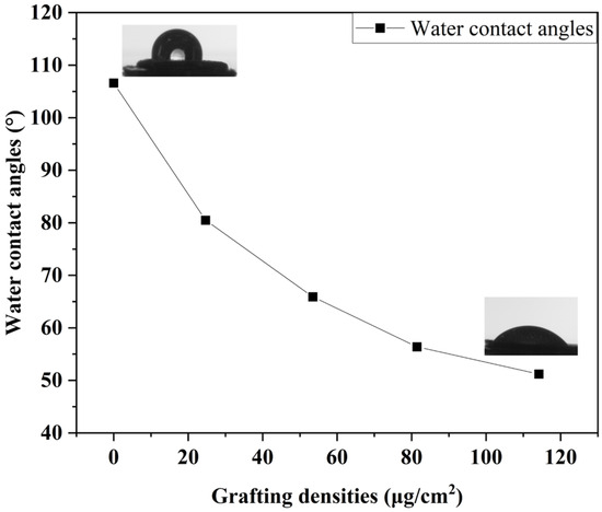 Contact angle on the NR/GO-SBMA film surface with different grafting densities.