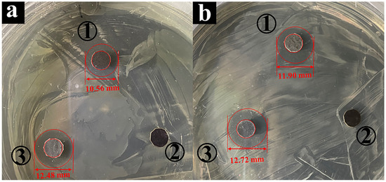 The ability to resist bacterial adhesion or biofilm formation depends on certain factors for the NR/GO composite film, such as surface properties, bacterial strength, growth medium, and temperature [49]. The zwitterionic groups of the modified polymer brushes on the substrate surface have high resistance to non-specific protein adsorption, bacterial adhesion, and biofilm formation due to electrostatic-induced hydration [49,50,51]. The cationic portion of the zwitterionic groups interacts with negatively charged bacterial cell membranes to result in the effect of cell lysis [52,53,54]. Gram-negative bacterium E. coli and Gram-positive bacterium S. aureus are common and representative infection strains [55], which are used to evaluate the antibacterial effect of the NR/GO and NR/GO-PSBMA films. Antibacterial activity was determined through the use of the disc diffusion assay of NR/GO films and NR/GO-PSBMA films (Figure 5). The inhibition zone against E. coli was not observed in the sample of NR/GO film (a2). In contrast, the NR/GO-PSBMA films (a3) showed a clear inhibition zone (d = 12.48 ± 0.21 cm), and E. coli could not grow in this zone. For S. aureus, the NR/GO-PSBMA (b3) films also showed a clear inhibition zone (d = 12.72 ± 0.25 cm), and the inhibition zone was not observed in the sample of NR/GO film (b2). The PSBMA brush-modified NR/GO composite films had high grafting density and excellent antibacterial activity based on the “grafting-from” method.