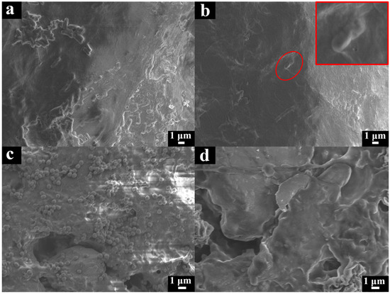 There was a mountain of E. coli (Figure 7a) and S. aureus (Figure 7c) attached to the surface of the NR film in the SEM photos. On the contrary, the surface of the NR/GO-PSBMA films showed fewer E. coli (Figure 7b) and S. aureus (Figure 7d) attached to the surface because the PSBMA exhibited high resistance to bacterial adhesion and prevented the formation of biofilm [49]. In addition, the morphology of E. coli bacteria (Figure 7b) attached to the surface of NR-PSBMA was irregular and underwent partial collapse. The potential mechanism of this phenomenon was that the PSBMA polymer induced cytotoxicity, cell growth arrest, and cell death by binding to bacterial cell membranes to produce reactive oxygen species (ROS) [58,59,60].