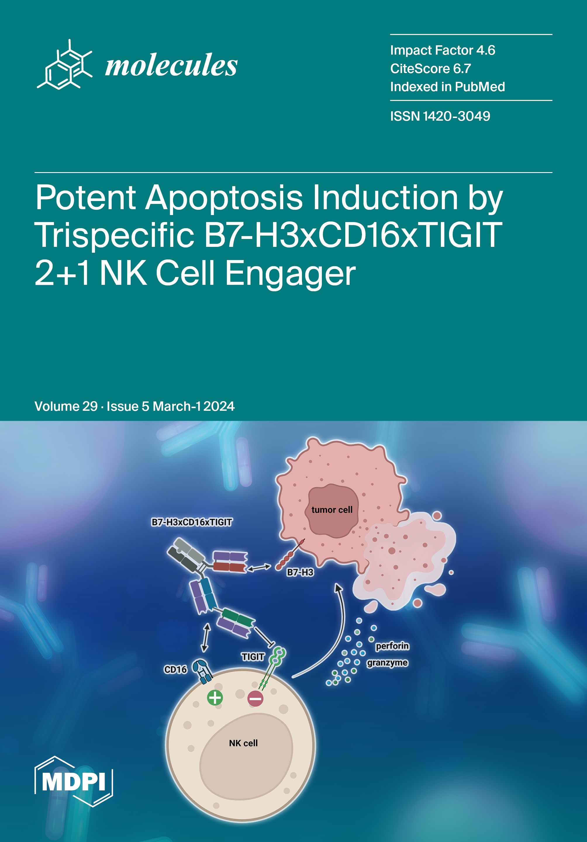 Cover Story: NK cells are highly valued in immunotherapy for their ability to rapidly kill tumor cells as well as their favorable safety profile. Their cytotoxic function is governed by a complex interplay of activating and inhibiting receptors, presenting a plethora of antigens for functional modulation via antibodies. Effective NK cell activation is attainable through the stimulation of activating receptors such as CD16, or by blocking inhibitory checkpoint molecules like TIGIT. Coupled with a binding domain for tumor-associated proteins such as B7-H3, these components can orchestrate the formation of an immunological synapse. The novel trispecific 2+1 common light chain NK cell engager B7-H3xCD16xTIGIT combines these three functionalities, facilitating potent apoptosis induction of cancer cells. View this paper
