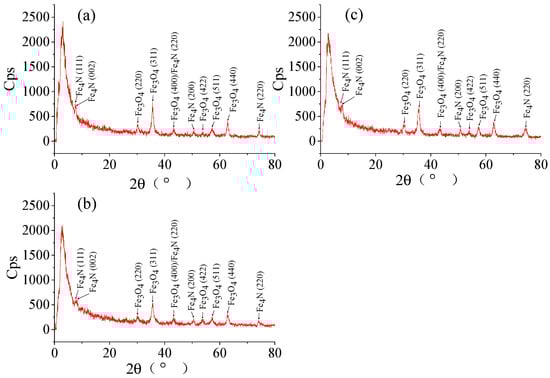 The SEM images of the NH2-functionalized nano-sized magnetic MOFs, i.e., spherical-magnetic MOFs, cubic-magnetic MOFs and triangular cone-magnetic MOFs, are shown in Figure 1. It is revealed that the morphologies of spherical-magnetic MOFs without using ammonium hydroxide in the preparation are spherical with a diameter of 50 nm. Meanwhile, with an increased amount of ammonium hydroxide used in the preparation procedure, the morphology of magnetic MOFs is changed to cubic and triangular cone, respectively. The XRDs of magnetic MOFs are shown in Figure 2, which was considered the representative for the discussion. According to Figure 2, six characteristic peaks of Fe3O4 at 2θ of 30.1°, 35.5°, 43.1°, 53.4°, 57.0° and 62.6° were found in the XRD patterns of three kinds of magnetic MOFs, i.e., spherical-magnetic MOFs, cubic-magnetic MOFs and triangular cone-magnetic MOFs, which corresponded to the indices (220), (311), (400), (422), (511) and (400). Furthermore, peaks of Fe4N at 2θ of 7.3°, 8.2°, 43.3°, 50.5° and 74.6° were found in the XRD patterns of three kinds of magnetic MOFs, which corresponded to indices (111), (002), (110), (200) and (220), and this result was consistent with the literature [56]. It can be concluded that the modification of Fe3O4 nanoparticles did not make measurable changes in the phase property of magnetic cores, and the Fe-N of magnetic MOFs was formed.