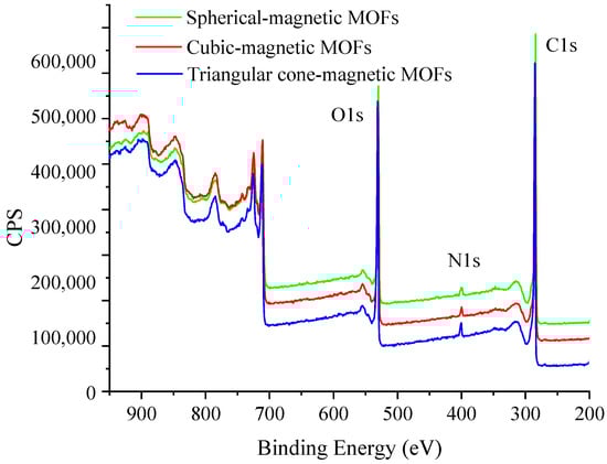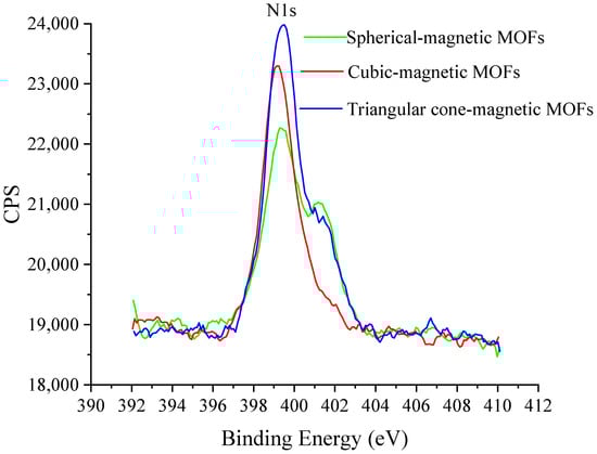 The chemical composition of NH2-functionalized nano-sized magnetic MOFs were studied by XPS. According to the results shown in Figure 4, characteristic signals for oxygen (O 1s) and carbon (C 1s) were directly found at 532.2 eV and 284.6 eV. The appearance of a signal at 398.8 eV was assigned to nitrogen (N 1s), which was introduced by the functional group of EDA. Furthermore, another interesting phenomenon found was that with an increasing amount of ammonium hydroxide used in the preparation procedure, the abundance of nitrogen increased remarkably for the magnetic MOFs. The N 1s high-resolution scan of spherical-magnetic MOFs, cubic-magnetic MOFs and triangular cone-magnetic MOFs are shown in Figure 5. The dependence of the abundance of nitrogen in magnetic MOFs on the usage amount of ammonium hydroxide may be explained by the fact that with the increasing ratio of ammonium hydroxide in the reaction system, the alkaline was increased, and amino groups of EDA chelate more easily with Fe, resulting in a higher chance of forming magnetic MOFs.