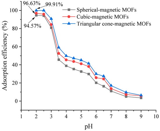 To investigate the effect of the pH of the water sample on the adsorption efficiencies of the magnetic MOFs, 40 mL of spiked water sample (50 mg/L, Cr(VI)) with pH values ranging from 2.0 to 9.0 were adsorbed with 50 mg magnetic MOFs. As shown in Figure 6, adsorption efficiencies of magnetic MOFs were remarkably pH dependent. With the water pH value increased from 2.0 to 9.0, the percentage of adsorption of Cr(VI) extremely decreased from 99.07% to 3.51%, 99.23% to 5.76% and 99.91% to 6.40% for spherical-magnetic MOFs, cubic-magnetic MOFs and triangular cone-magnetic MOFs, respectively. The dependence of the adsorption properties of magnetic MOFs to Cr(VI) on sample pH may be illustrated by ion exchange and electrostatic attraction in the adsorption process of Cr(VI) from the water sample by magnetic MOFs. The surfaces of magnetic MOFs are covered with -NH- groups, which can be varied in form with different pH values. Under lower pH values (pH ranging from 2.0 to 6.5), Cr(VI) mainly exists in the soluble form of HCrO4−; meanwhile, -NH- groups are easily protonated, and so, the electrostatic attraction occurs as shown in Equation (1),