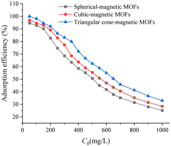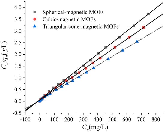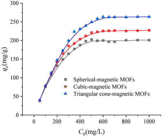 The effect of initial concentration on the adsorption of Cr(VI) was studied for magnetic MOFs by varying the initial concentration of Cr(VI) from 50 mg/L to 1000 mg/L. According to the results in Figure 7, it can be seen that the adsorption efficiencies of spherical-magnetic MOFs onto Cr(VI) decreased with the increasing initial concentration of Cr(VI); however, the adsorption capacities of spherical-magnetic MOFs onto Cr(VI) increased. In the case of cubic-magnetic MOFs and triangular cone-magnetic MOFs, similar curve shapes were also found. This phenomenon can be explained by the fact that, in the case of the fixed dosage of magnetic MOFs, the usable adsorption sites are finite, resulting in a clear decrease in the removal of Cr(VI) with increasing initial concentration. Meanwhile, the adsorption capacity of magnetic MOFs to Cr(VI) increased before it obtained the maximum adsorption capacities with increasing initial concentration. In this work, the equilibrium concentration for spherical-magnetic MOFs, cubic-magnetic MOFs and triangular cone-magnetic MOFs were 450, 550 and 600 mg/L, while the adsorption capacities were 198.42, 223.18 and 263.50 mg/g, respectively (Figure 8).