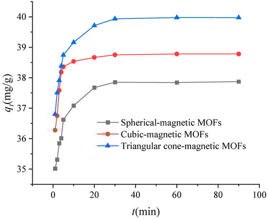 To investigate the adsorption kinetic process of Cr(VI) onto magnetic MOFs, batch experiments were obtained by varying the adsorption time from 1.0 to 90 min at a temperature of 35 °C with pH at 2.0; the results are shown in Figure 10. According to the results, the adsorption rate of magnetic MOFs to Cr(VI) was initially very high and slowly achieved an equilibrium in 30 min. Although it took 30 min to achieve equilibrium, the adsorption capacities of magnetic MOFs to Cr(VI) obtained at any time (qt) got to ~97% of that at equilibrium within the first 5 min. The adsorption kinetic data have been analyzed by a pseudo-second-order model, and related parameters such as rate constant (k2) and calculating equilibrium adsorption capacity (qe.c) are listed in Table 2, which indicated that the adsorption kinetic process of Cr(VI) onto magnetic MOFs well fit the pseudo-second-order rate equation. The qe.c obtained from the pseudo-second-order model (37.87, 38.76 and 39.84 mg/g) were close to the experimental qt (37.85, 38.79 and 39.96 mg/g) for spherical-magnetic MOFs, cubic-magnetic MOFs and triangular cone-magnetic MOFs, respectively. It indicated that the pseudo-second-order model can be used for the prediction of adsorption kinetics. The adsorption capacities of magnetic MOFs were proportional to the active sites on the surface of adsorbents [52]. Along with increased -NH- groups, active sites on the surface of magnetic MOFs increased as well, which resulted in the increase of qt for the adsorbents.