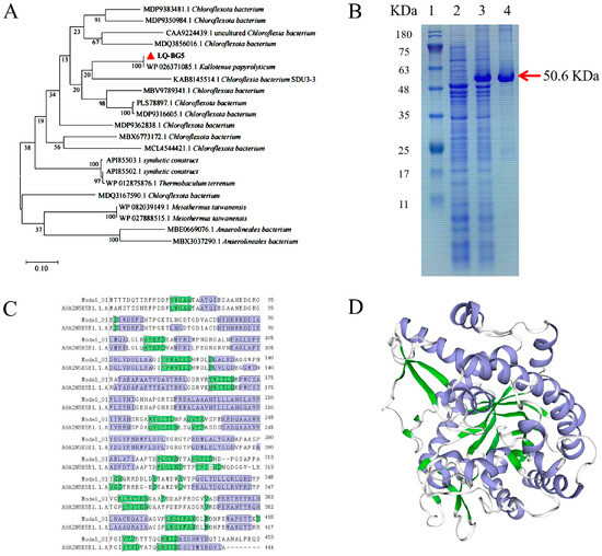 (A) Phylogenetic dendrogram obtained by maximum likelihood analysis based on amino acid sequences showing the phylogenetic position of LQ-BG5 with related β-glucosidases. Bootstrap values (expressed as a percentage of 1000 replications) are given at nodes. (B) SDS-PAGE analysis of LQ-BG5. Lane 1, protein molecular weight marker; Lane 2, protein of E. coli DH5α prior to induction; Lane 3, total protein of E. coli DH5α/pSHY211- LQ-BG5; Lane 4, purified LQ-BG5 protein. Complete SDS-PAGE image was shown in Supplementary Figure S4. (C) Comparison of the amino acid sequences of LQ-BG5 with the homology model. (D) LQ-BG5 homology model. Purple and green structures represent α-helix and β-fold, respectively.