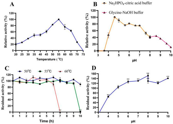 Effects of temperature and pH on the activity and stability of the recombinant LQ-BG5. (A) Temperature effect on the activity of LQ-BG5. (B) pH effect on the activity of LQ-BG5. (C) The effect of temperature on stability at different temperatures (50, 55, and 60 °C) for 0, 1, 2, 3, 4, 5, 6, 7, 8, 9, and 10 h. (D) The effect of pH on stability. Values represent the mean of three biological replicates. Error bars represent the mean ± SEM of three biological replicates. Significance analysis was performed for the effect of temperature and pH on enzyme stability. ** p < 0.01. The primary activity was taken as 100%. In total, 100% = 7.0 ± 2.1 U/mg.