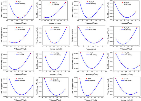 Typically, the total energy of the relevant phase is calculated as a function of volume. The energy–volume relationship determines the equilibrium energy E(V0), equilibrium volume (V0), and bulk modulus (B0), as defined in Equation (1). As an example, Figure 3 shows the energy–volume relationship of the cementite M3X (M = Fe, Cr; X = C, B). The lattice parameters (a, b, and c) of the cementite at equilibrium volume were calculated by optimizing the interatomic forces and stresses in the unit cell.