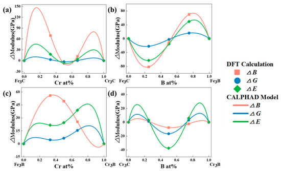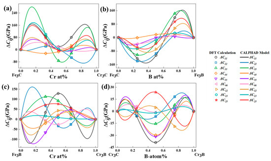 The elastic of modulus cementite-type M3X (M = Fe, Cr; X = C, B) calculated by DFT and fitted by CALPHAD model. (a) (Fe,Cr)3C, (b) Fe3(C,B), (c) (Fe,Cr)3B and (d) Cr3(C,B).
